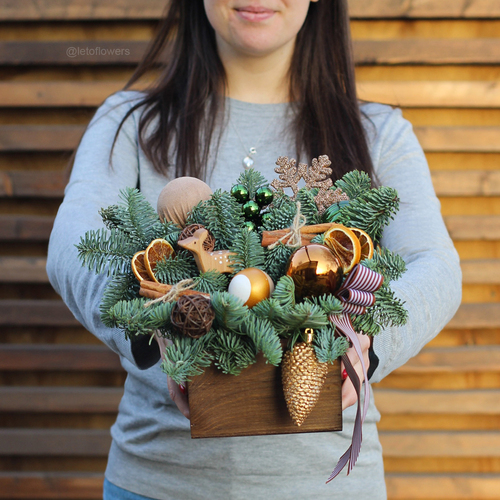 - New Year composition in a wooden box. Fancy, appealing and popular.