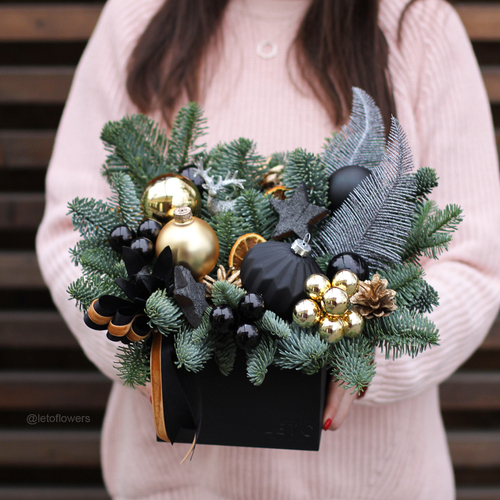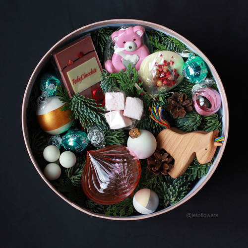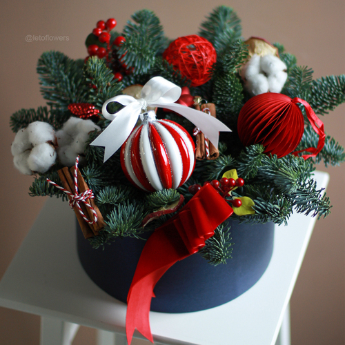 - New Year composition in a hat box. One more alternative to a composition in a wooden box. There’s also an option to order a box with sweets and Christmas decorations – it’s a compromise between a gift of sweets and a «usable» gift.