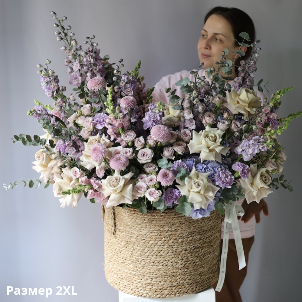 A lavender-toned flower basket is delicate and refined. Shades of lilac are associated with romance, creativity, and sensuality. A lavender basket evokes memories of a summer evening, when the sunset slowly approaches, tinting the sky with a soft lilac hue, the breeze gently stirs the tablecloth on the veranda, and champagne sparkles in the glass. This arrangement carries a light, French-inspired mood.