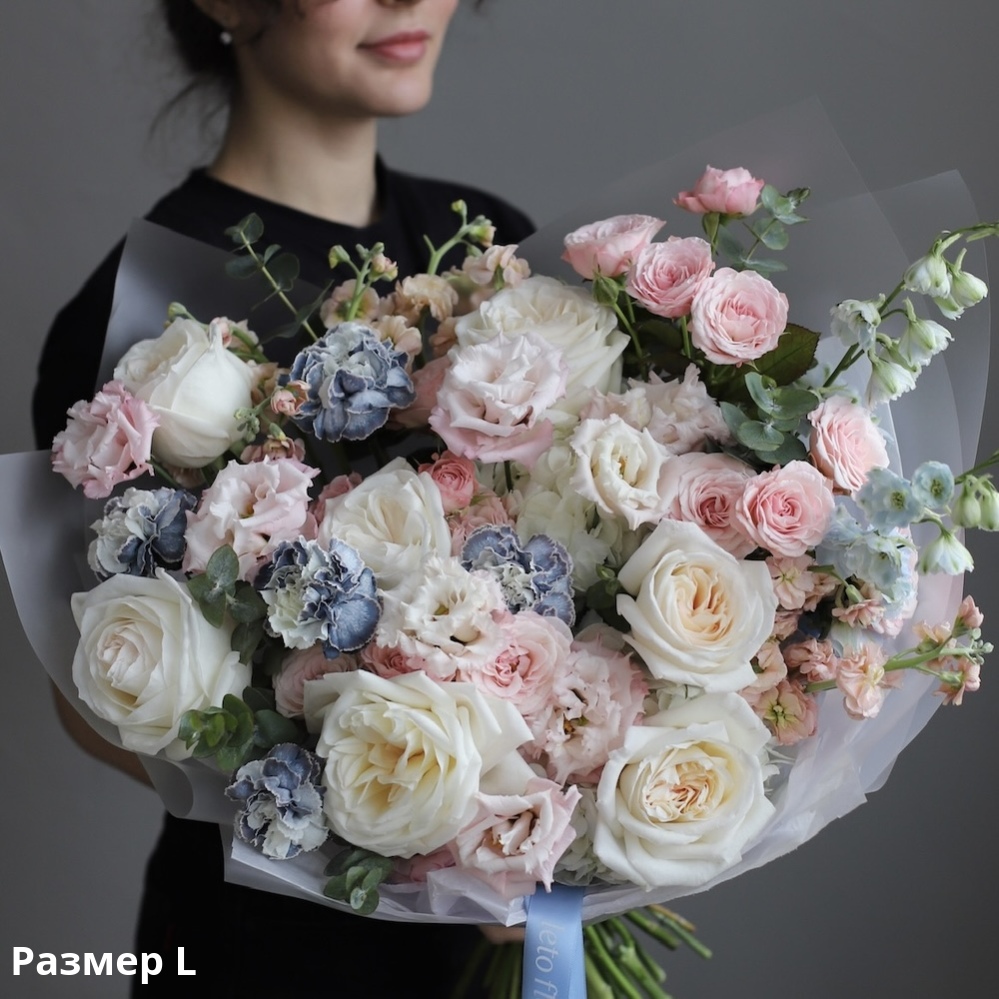Watercolor tones of this bouquet look very gently and romantic. It includes delicate blurry shades of pink, peachy, lavender and blue. We try to highlight the dominating and mood-setting tone which can be complemented by other colors.
