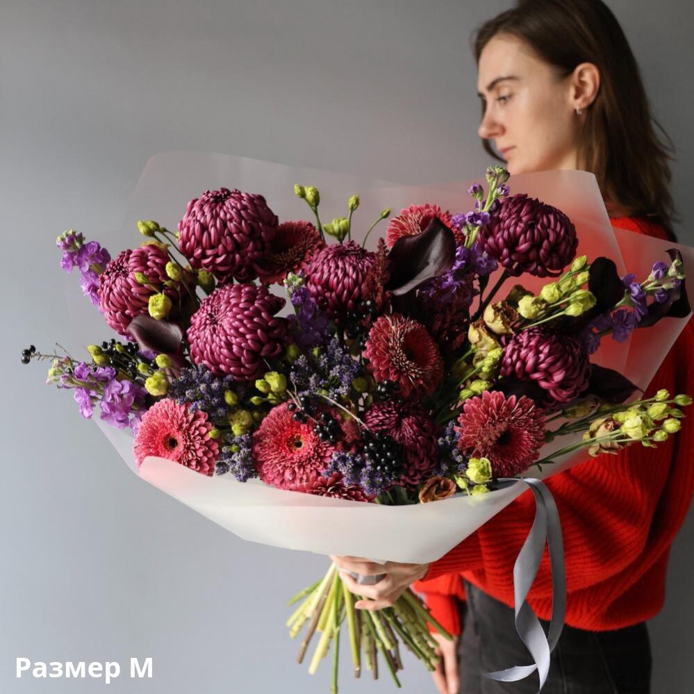 Deep and intensive purple, blue and dark blue shades of this bouquet look richly and magically. This combination attracts attention of all people around.