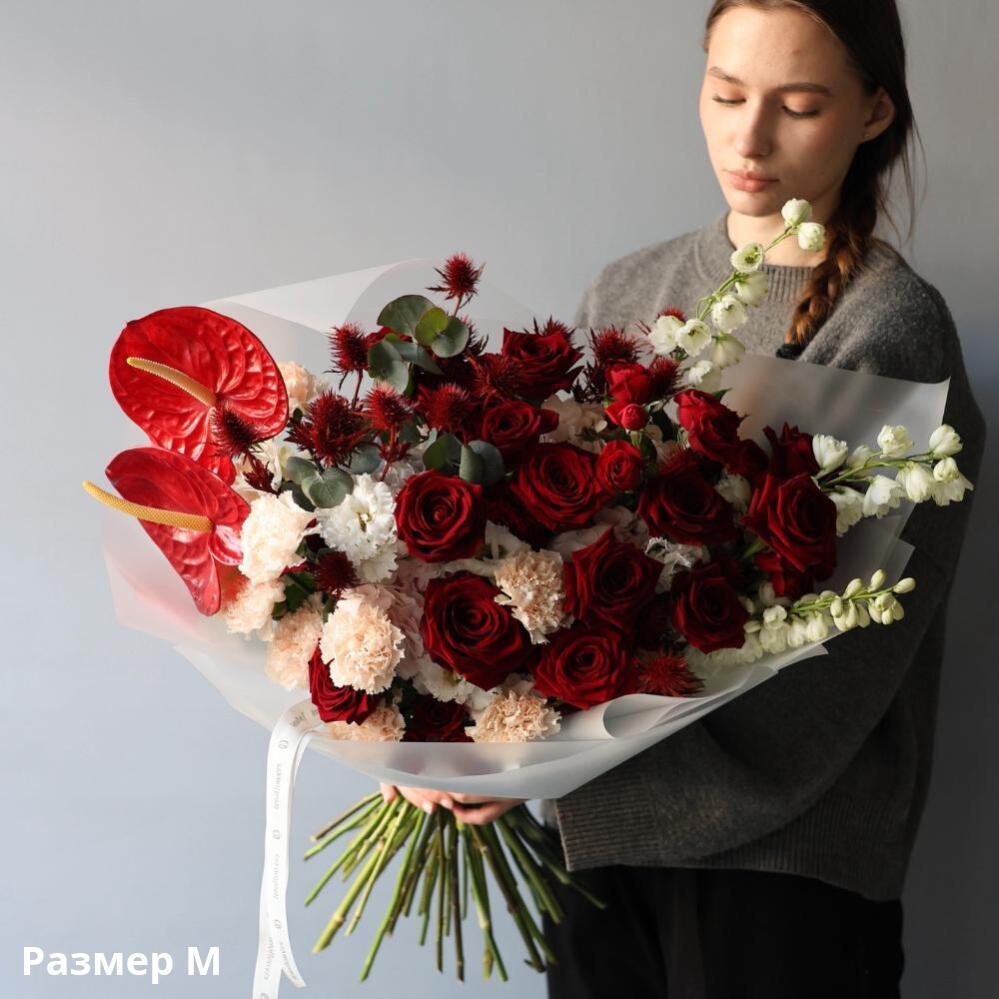 Signature bouquet in noble, vivid scarlet and burgundy shades is passionate and bright. It is perfect option to show your feelings.