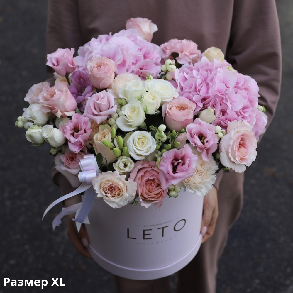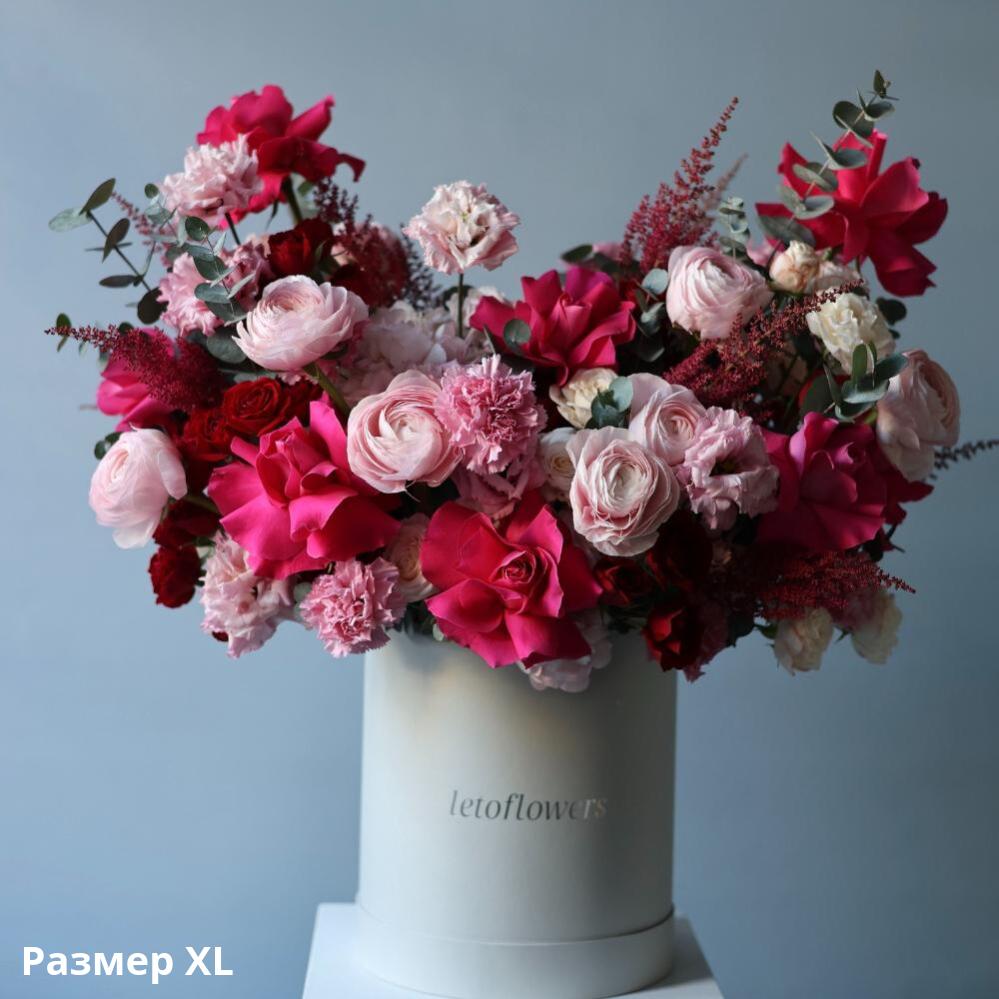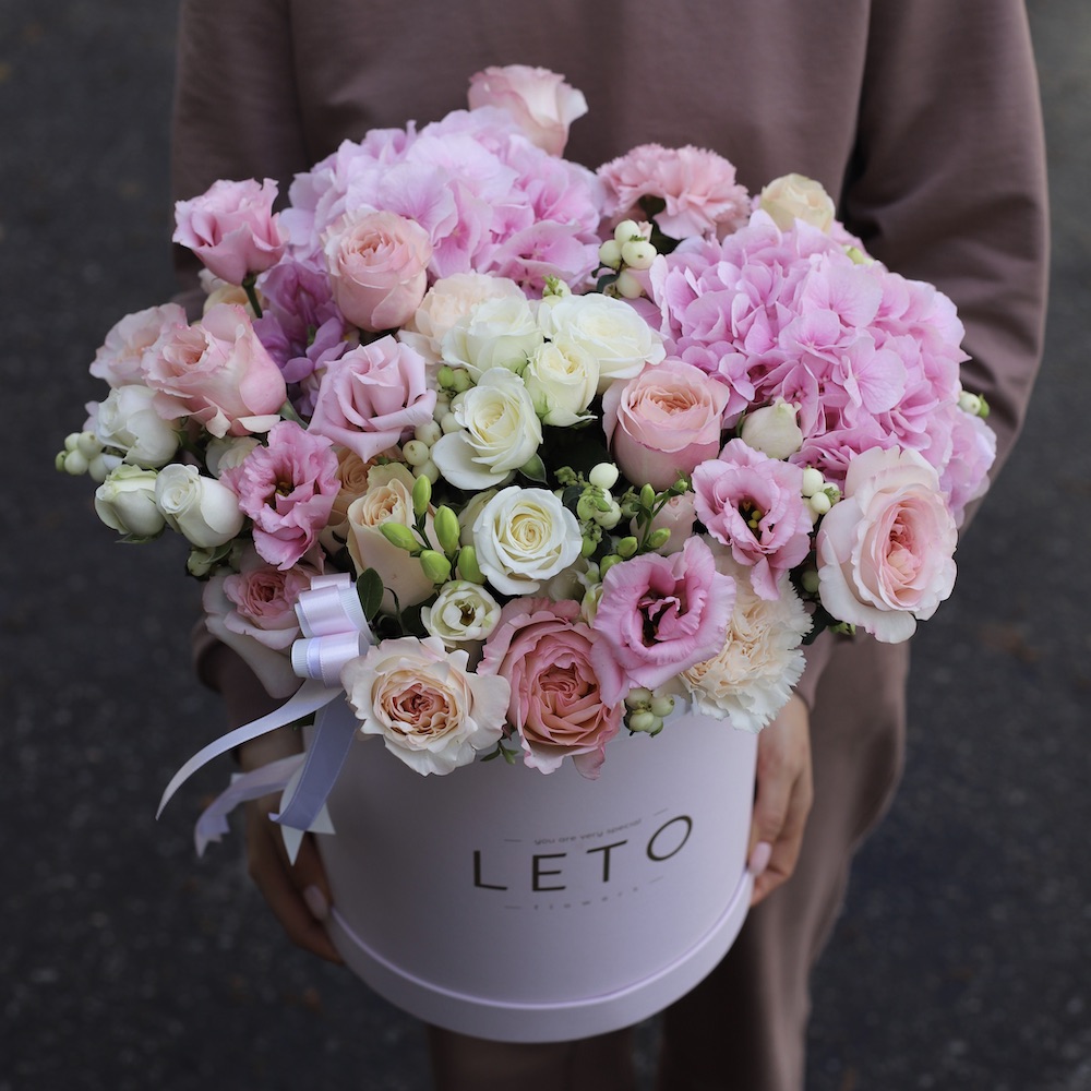 This signature bouquet in a hat box is made of the most romantic soft and bright pink shades flowers. Pink color symbolizes womanhood, but every tone has its own mood from active and saturated to calm and gentle. Flowers in a hat box need no further arranging once they arrive at your door.