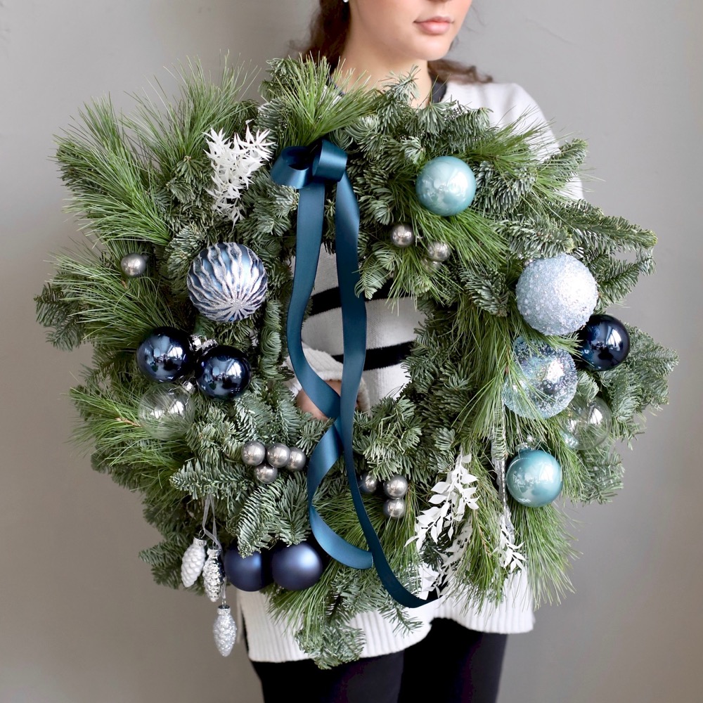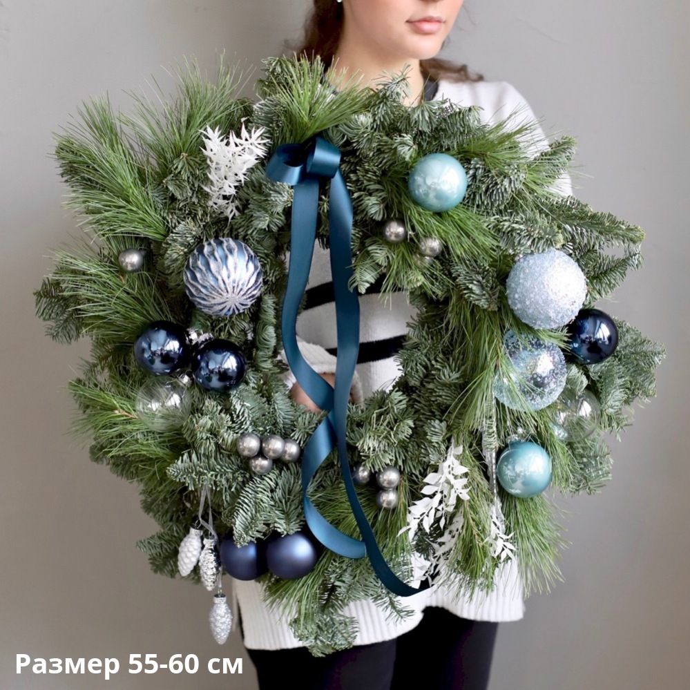The fashionable Christmas wreaths, which are gaining popularity, look very beautiful and stylish both on the front door, creating a festive atmosphere at first glance, and in the interior: the wreath can be hung on the wall or used to decorate the New Year's table. Thanks to its beautiful packaging, the wreath can also serve as a wonderful New Year's gift, especially for men (thanks to the blue color scheme).