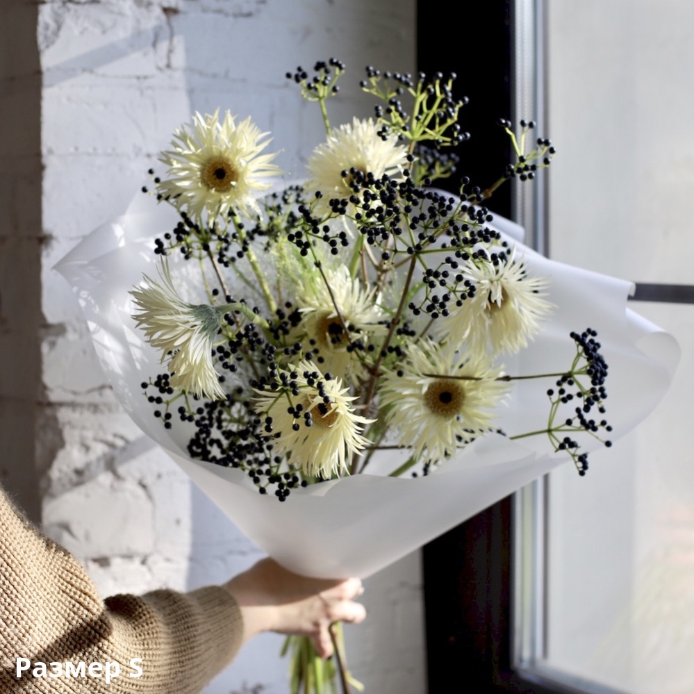 S: 7 gerbera, 3 berries, panikum M: 10 gerbera, 5 berries, panikum L: 19 gerbera, 10 berries, panikum
