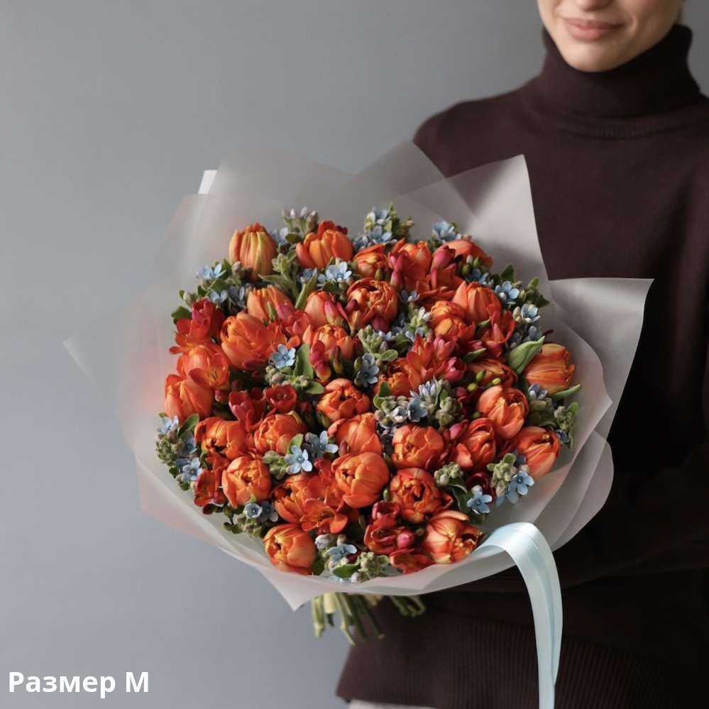 Double tulips bring depth and volume, oxypetalum adds lightness and freshness, and freesia fills the bouquet with a delicate, clean fragrance. The result is a refined yet warm floral composition.
