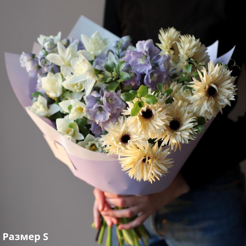 Combination of daffodils, delphinium and gerberas fully meets this spring picture.