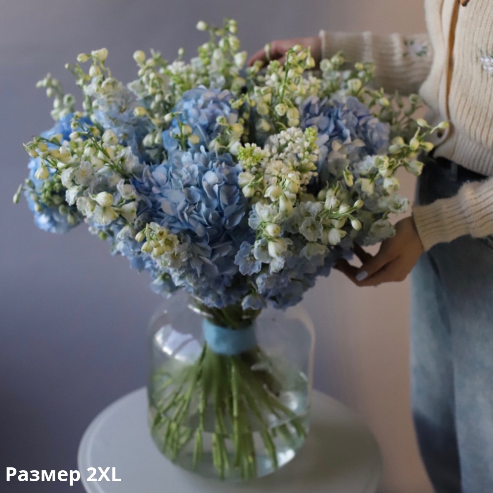 M: 10 Delphinium, 7 Lilac, 3 Hydrangeas L: 20 Delphinium, 10 Lilac, 5 Hydrangeas XL: 40 Delphinium, 15 Lilac, 7 Hydrangeas 2XL: 50 Delphinium, 20 Lilac, 10 Hydrangeas |