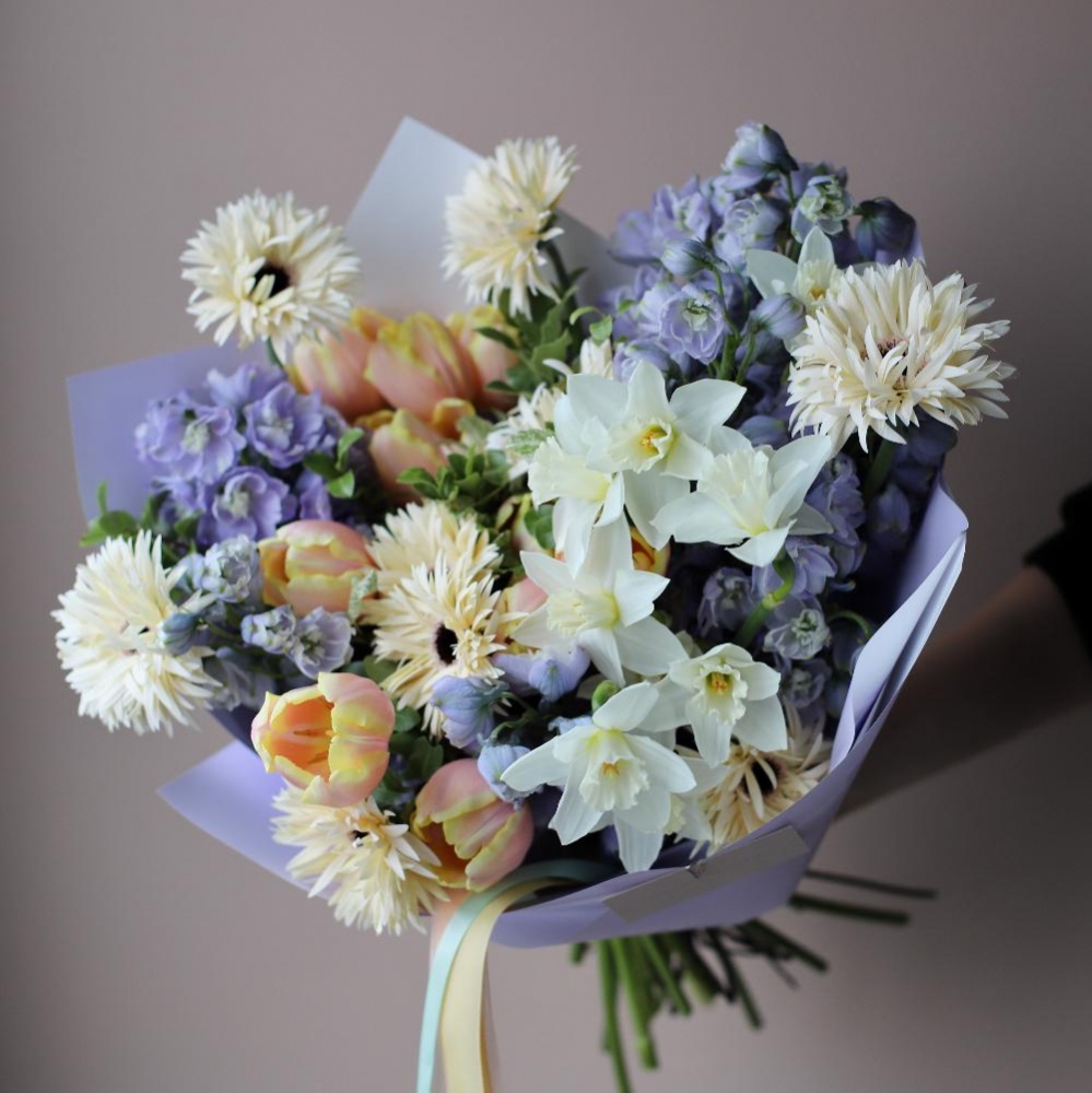 Combination of daffodils, delphinium, tulips and gerberas fully meets this spring picture.