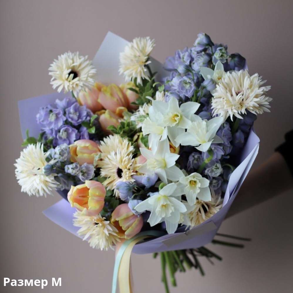 This bouquet is from our new spring collection. We designed these bouquets to show what spring is to us. It is gentle and bright at the same time, it is illuminated by soft sunrise with yellow, orange and pink hues. Flowers are light and full of fresh air.