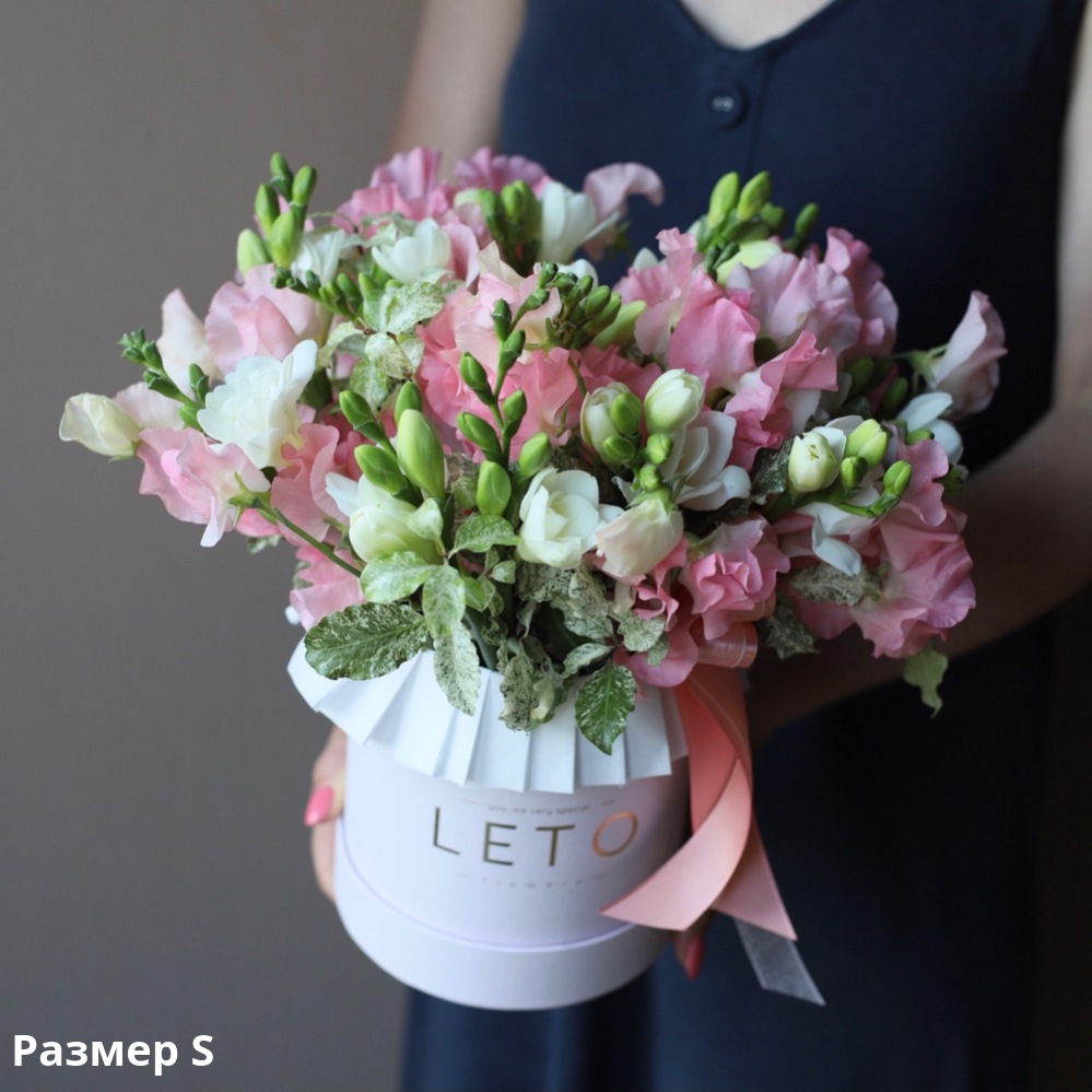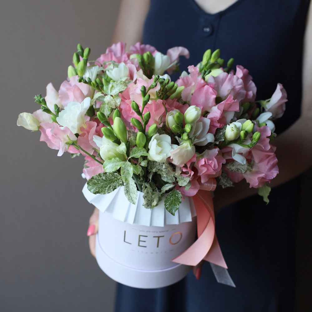 Sweet Pea with Freesia in a hat box
