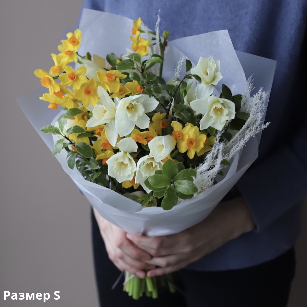 This bouquet is from our new spring collection. We designed these bouquets to show what spring is to us. It is gentle and bright at the same time, it is illuminated by soft sunrise with yellow, orange and pink hues. Flowers are light and full of fresh air.