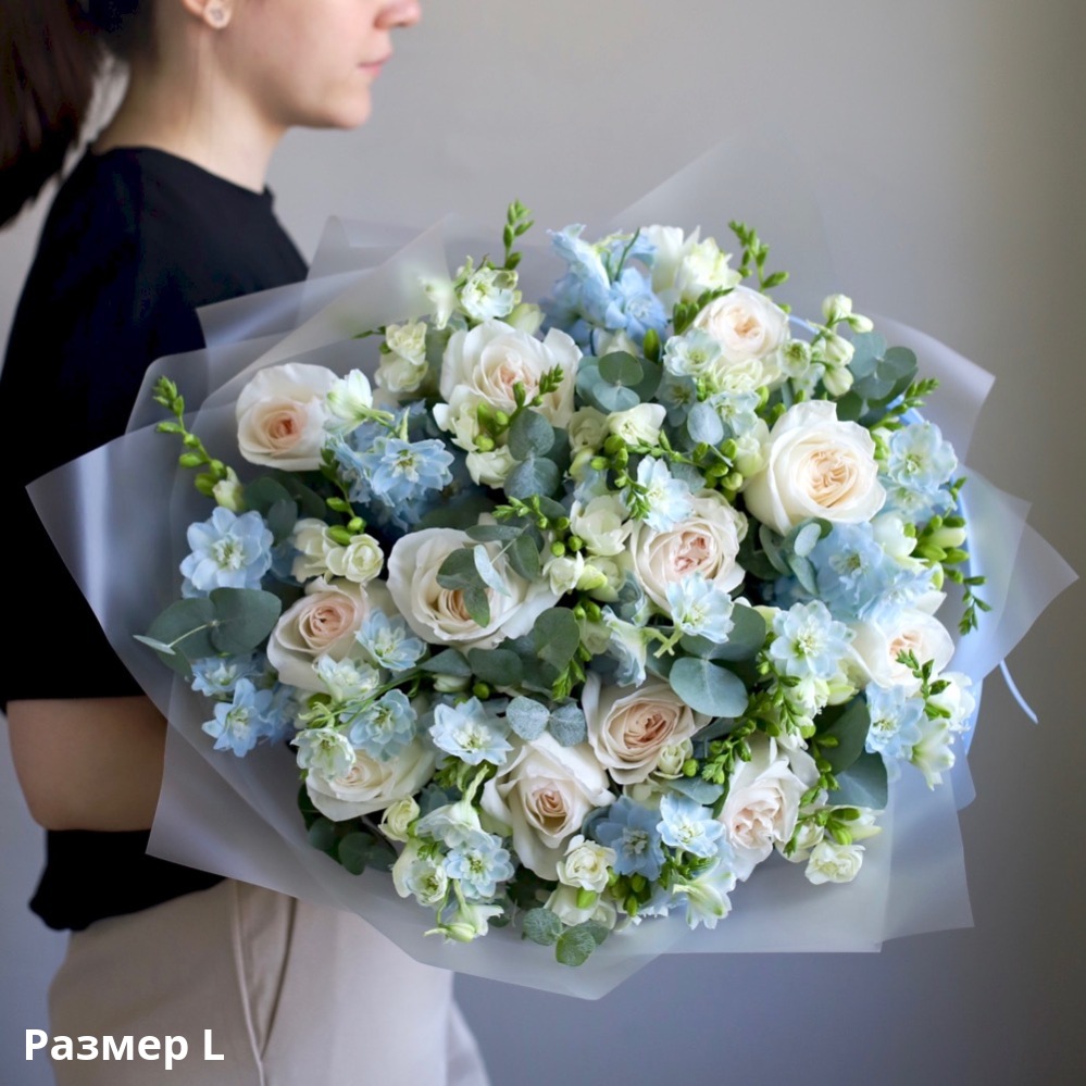 M 11 garden roses + 10 delphiniums + 20 freesias + greenery