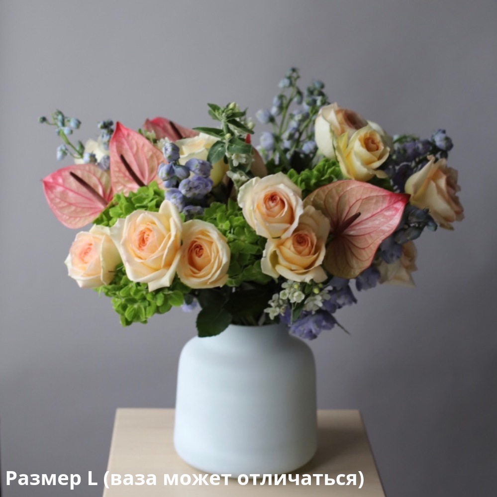 One of the popular bouquet color in our catalog is watercolor. It combines tender pink, blue, lavender and peachy hues. This combination always looks gentle and reminds sunset clouds.