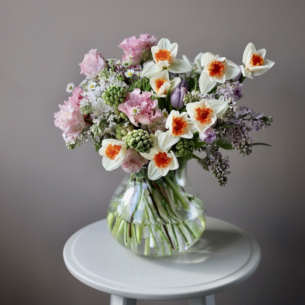 A bouquet in a vase needs no further arranging once they arrive at your door. You don’t need to take paper off, look for a fitting vase and cut stems, because florists have made it for you.