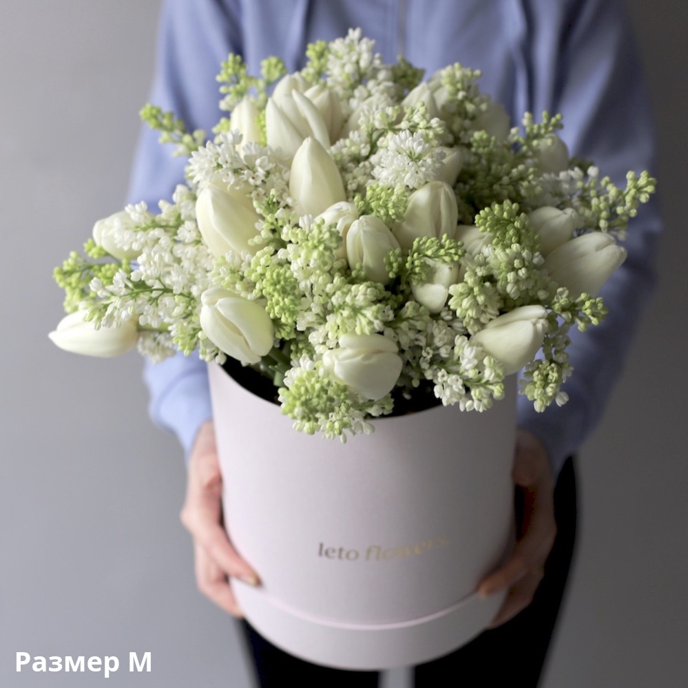 This bouquet is composed of delicate tulips and lush lilac. The photo shows one example; other color options are available.
