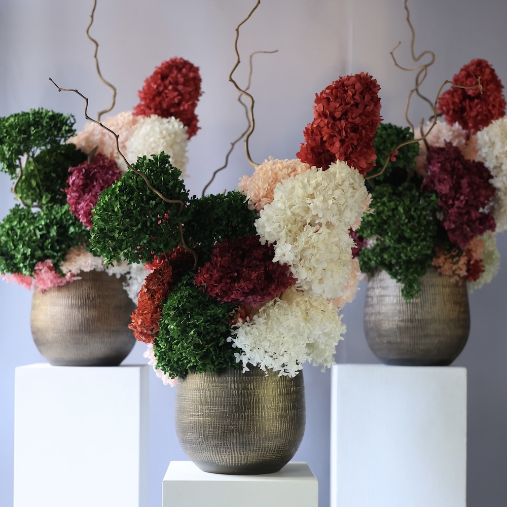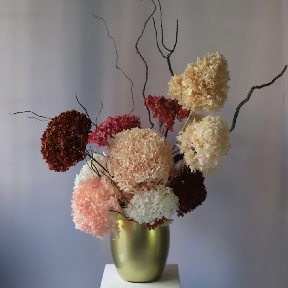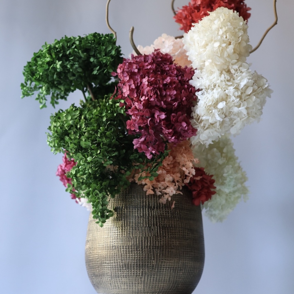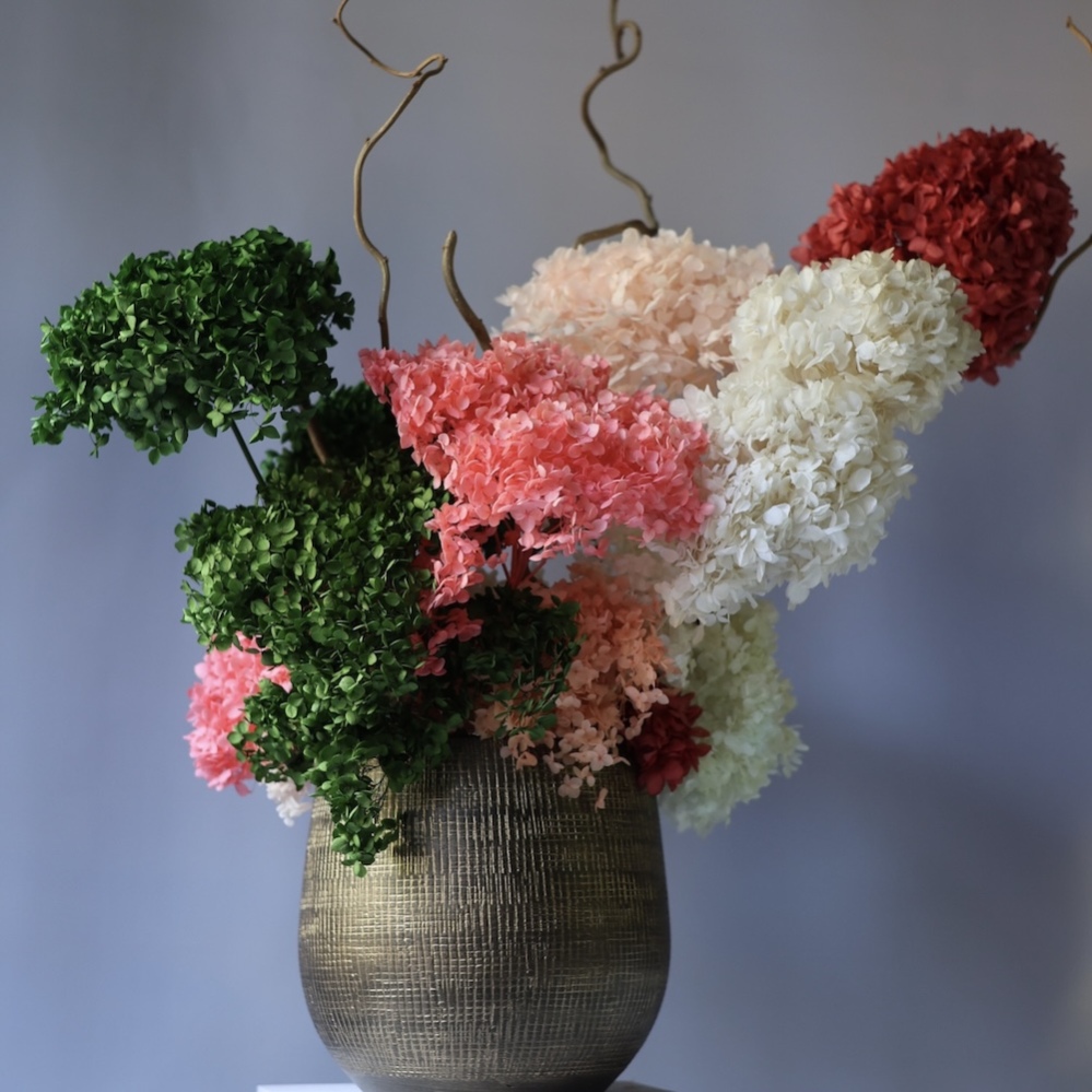 Stylish arrangement of premium-quality preserved flowers. Eternal hydrangeas keep their beauty for years without any care. Available in different colors and customized upon request. Made to order within one week.