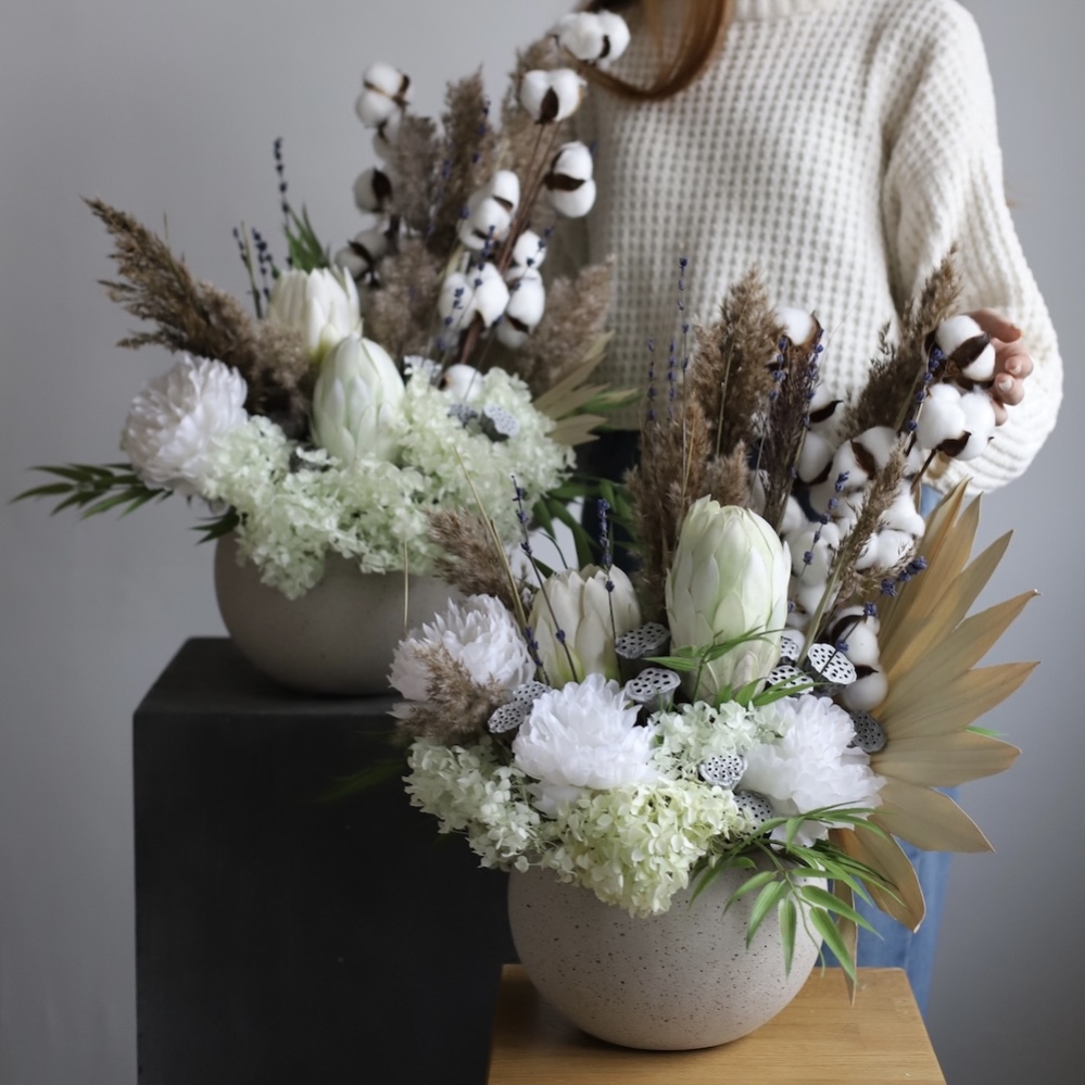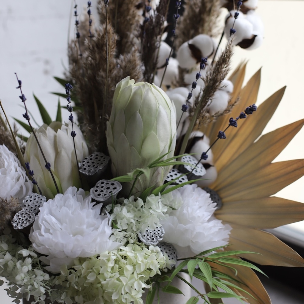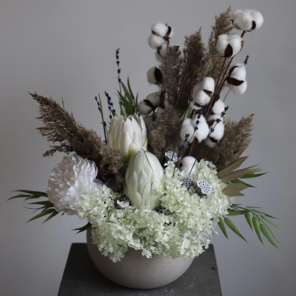 Stylish interior arrangement of premium-quality preserved flowers. The exotic protea, fluffy cotton, and textured dried flowers create a striking decorative accent. Eternal flowers that keep their beauty for years without any care.