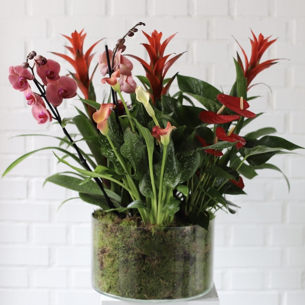 A tropical glass arrangement is a long-lasting, living gift and a chic decor piece. You can buy the Tropical Mix with orchids, anthuriums, and other exotic plants with delivery across the city. Minimal care, maximum impact.