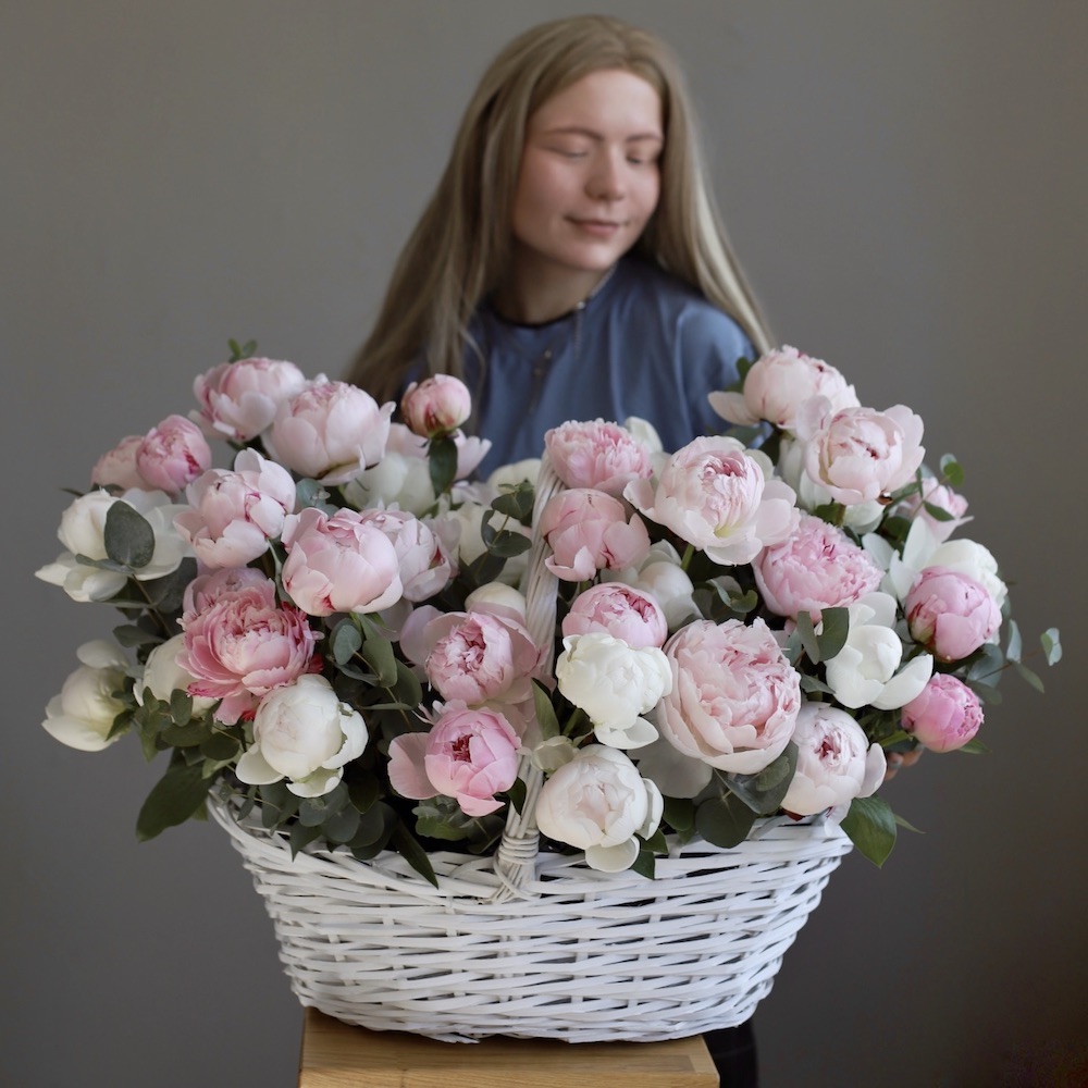 This basket is filled with luxurious pink peonies, each one unfolding like a little miracle. You can select gentle, pastel tones for an elegant composition, or opt for brighter, more vivid varieties to truly make a statement.