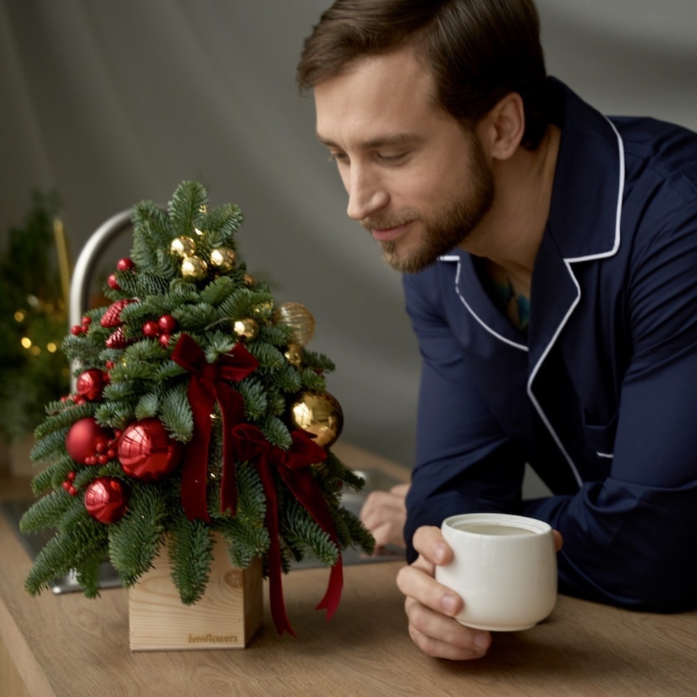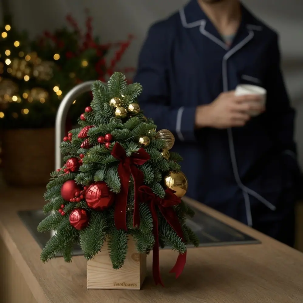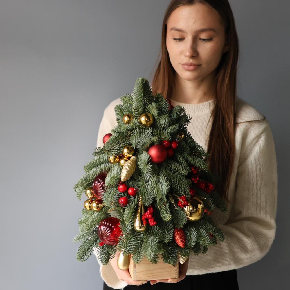 A classic combination of red and gold in a small-sized festive Christmas tree. Attracting attention with its toy-like neatness, everyone's favorite New Year's beauty creates a festive atmosphere, reminds of magic in any interior and fits on any surface, including small ones. A great way to create a mood for all New Year's holidays.