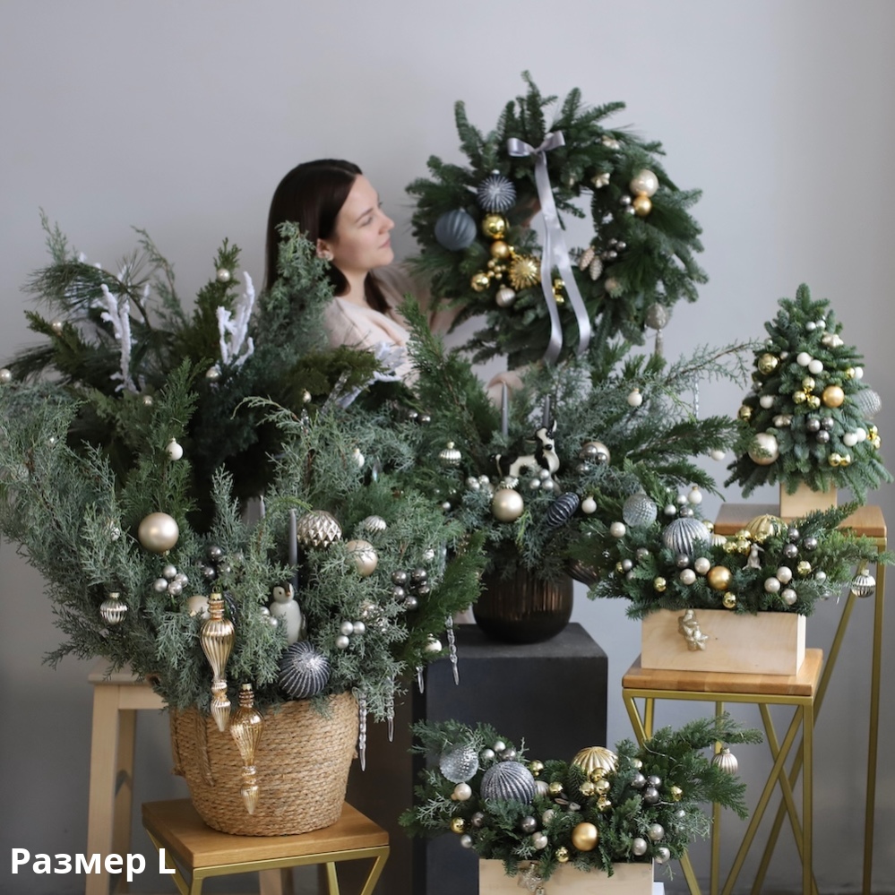 Compositions from the "Marengo" collection will be as close as possible to the examples on the site. The arrangement of the decor, the shade of the pine needles may differ, vases, boxes and flower pots can be replaced with similar analogues.