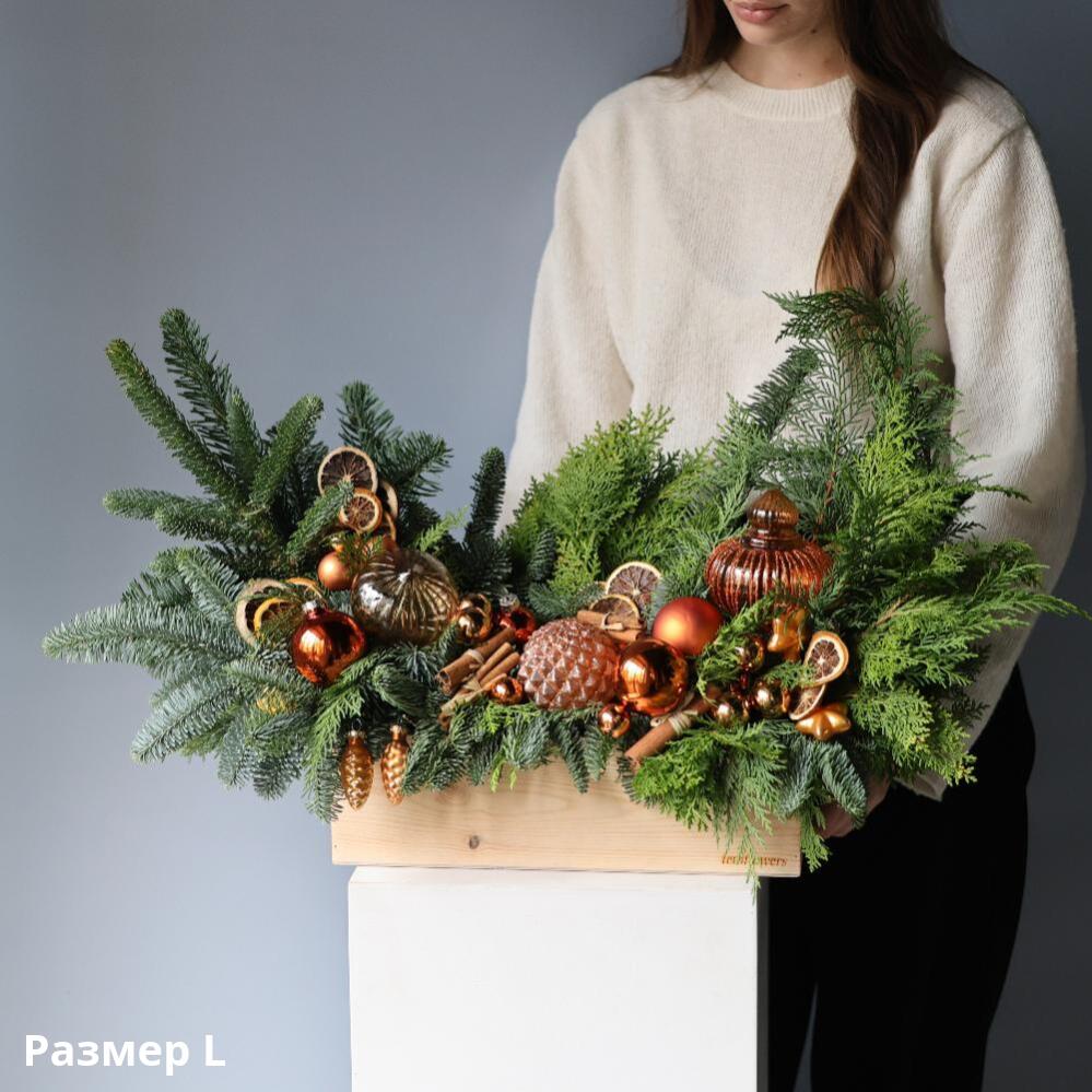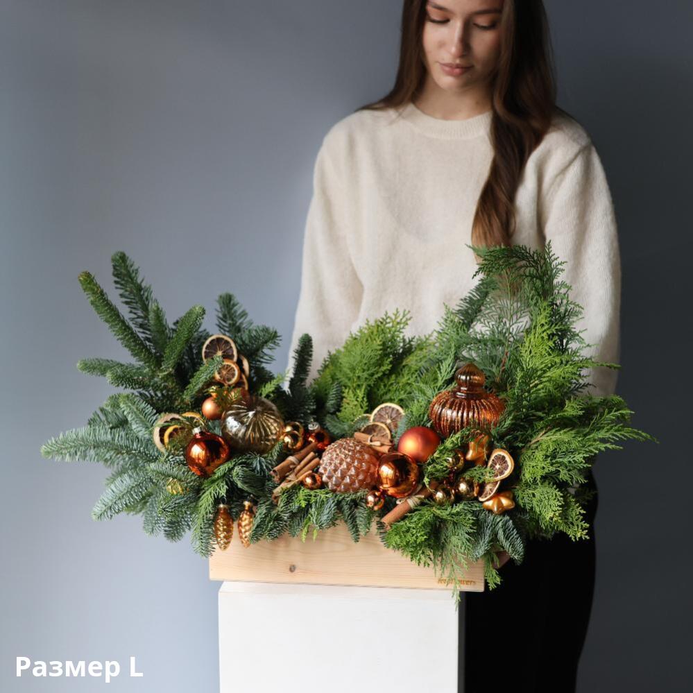 A winter composition in a box has already become a classic gift and decoration for the New Year. Natural pine needles give a pleasant aroma, and New Year's decor - a festive mood.