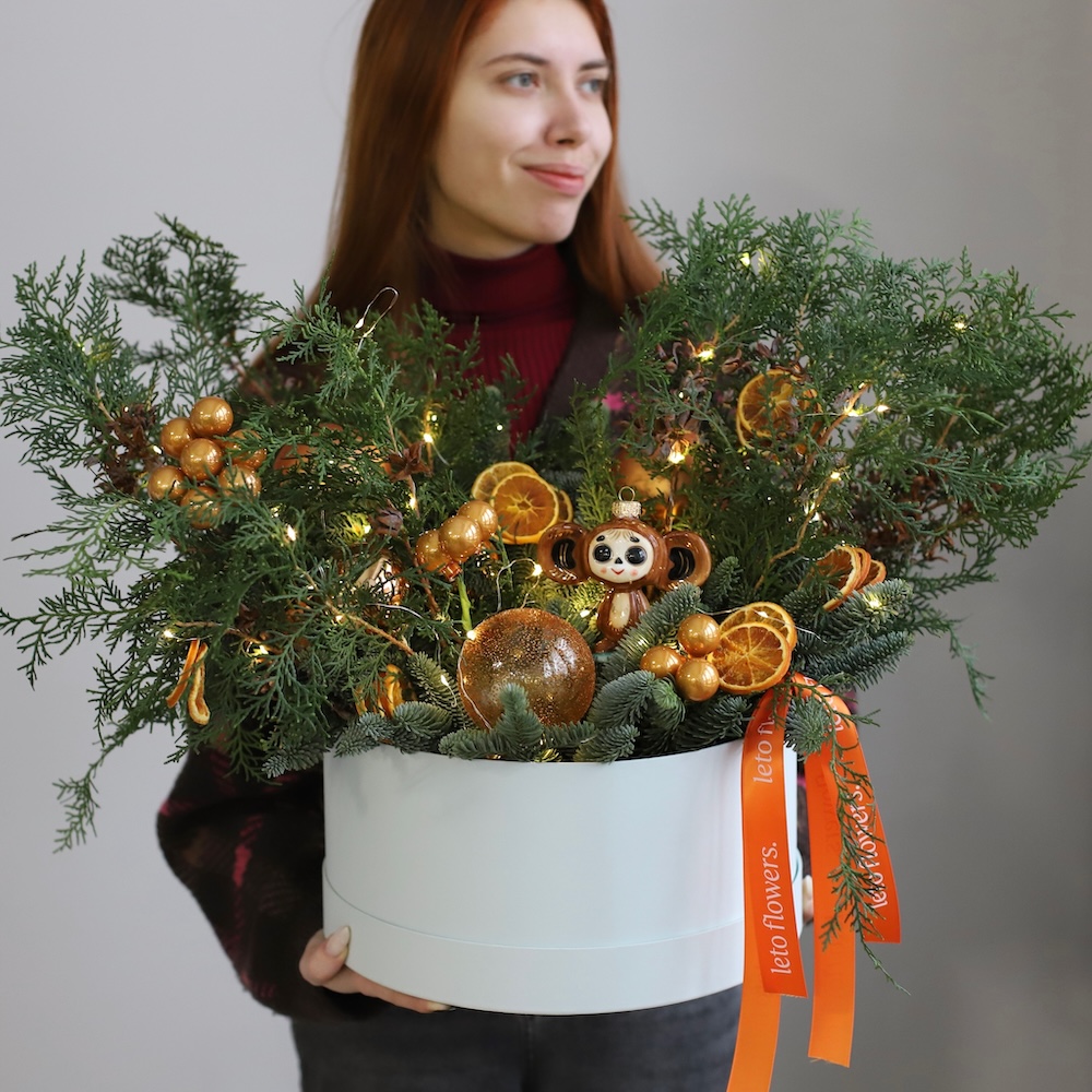 At the center of attention is the charming Cheburashka, surrounded by bright orange ornaments and dried oranges, adding a delightful touch of New Year fragrance to the basket.
