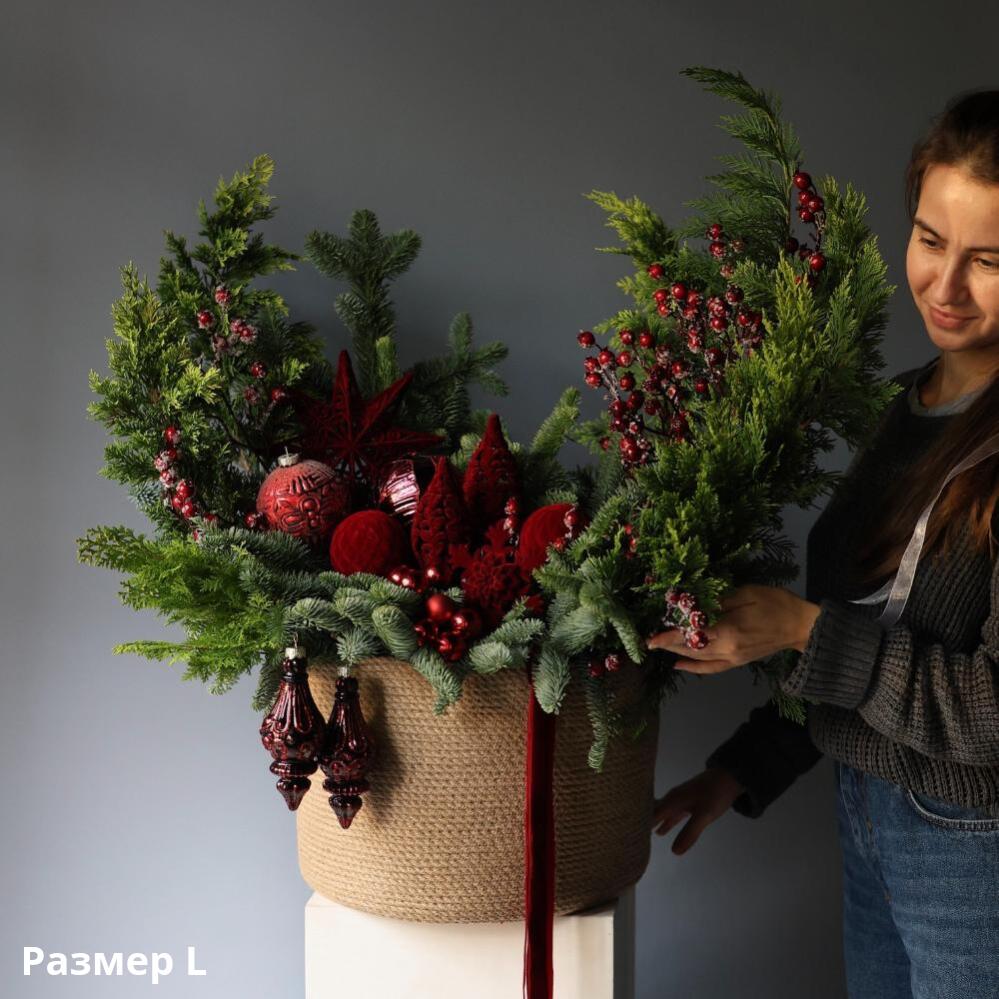 New Year compositions are made following the example on our website. How ever needles is a living system, it can be differ by size and hue.