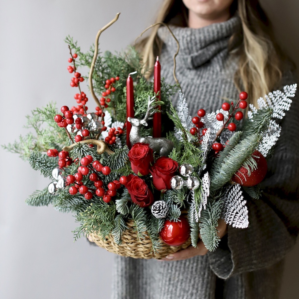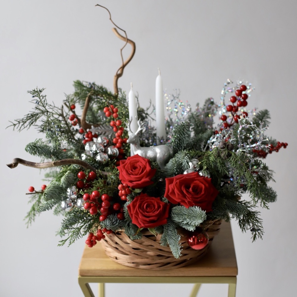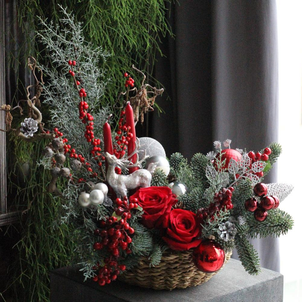 New Year basket with decor and flowers