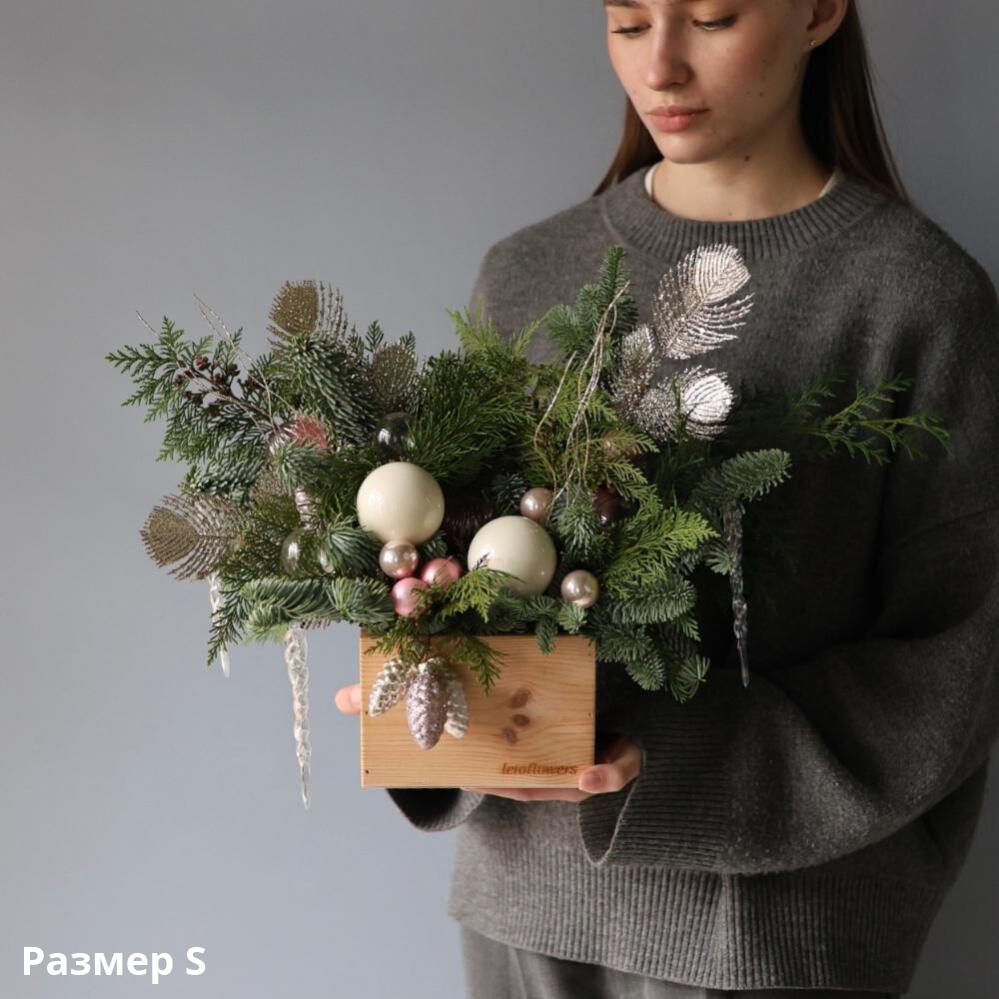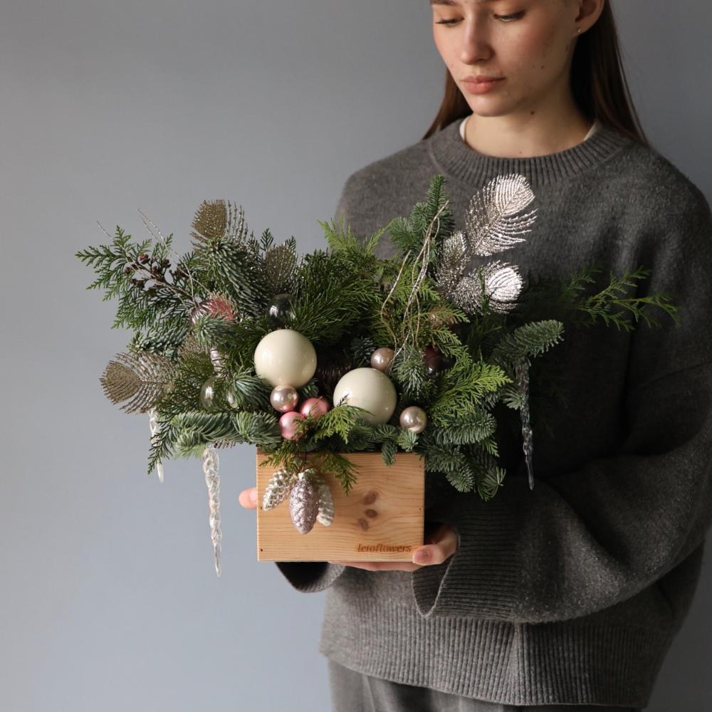 Compositions in boxes look impressive regardless of their size. Pine needles, decor and wood are ideally combined, creating an atmosphere of celebration and magic. They are extremely easy to care for: water the composition and it will stay fresh for a long time. A large composition will serve as a magnificent decoration not only for your home interior, but also for a festive event.