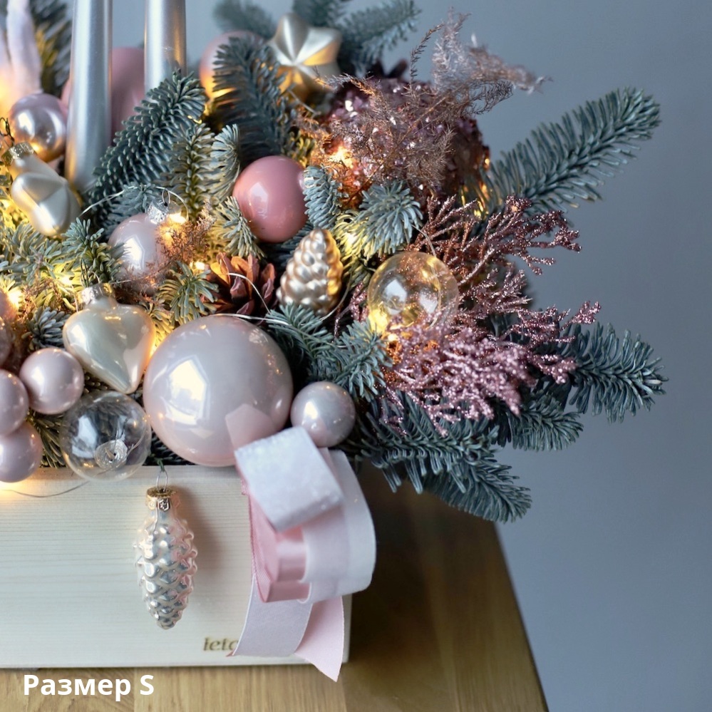 Compositions in boxes look impressive regardless of their size. Pine needles, decor and wood are ideally combined, creating an atmosphere of celebration and magic. They are extremely easy to care for: water the composition and it will stay fresh for a long time. A large composition will serve as a magnificent decoration not only for your home interior, but also for a festive event.