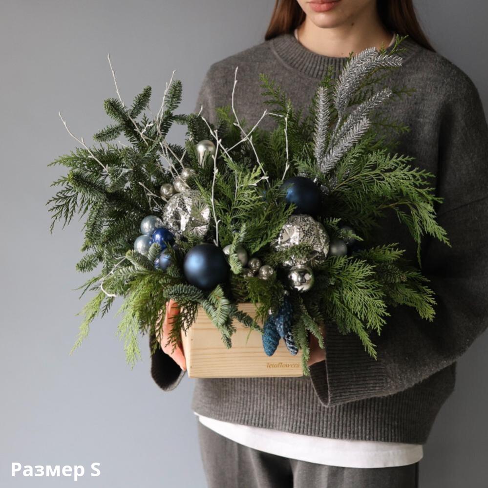 Compositions in boxes look impressive regardless of their size. Pine needles, decor and wood are ideally combined, creating an atmosphere of celebration and magic. Extremely easy to care for: water the composition and it will remain fresh for a long time. A large composition will serve as a magnificent decor not only for a home interior, but also for a festive event.