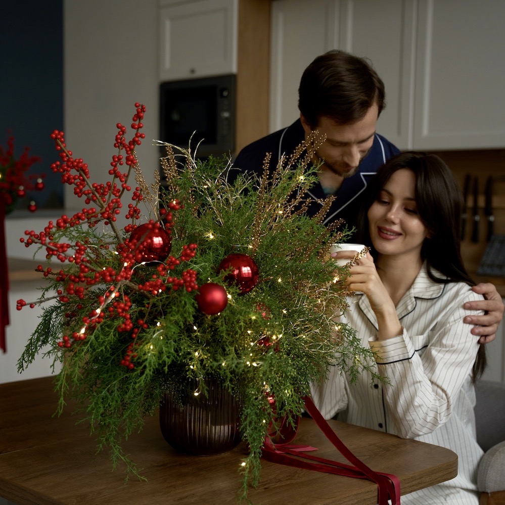• Stylish Design: The composition combines lush greenery with sophisticated holiday decorations, making it a centerpiece for your table, coffee table, or windowsill.