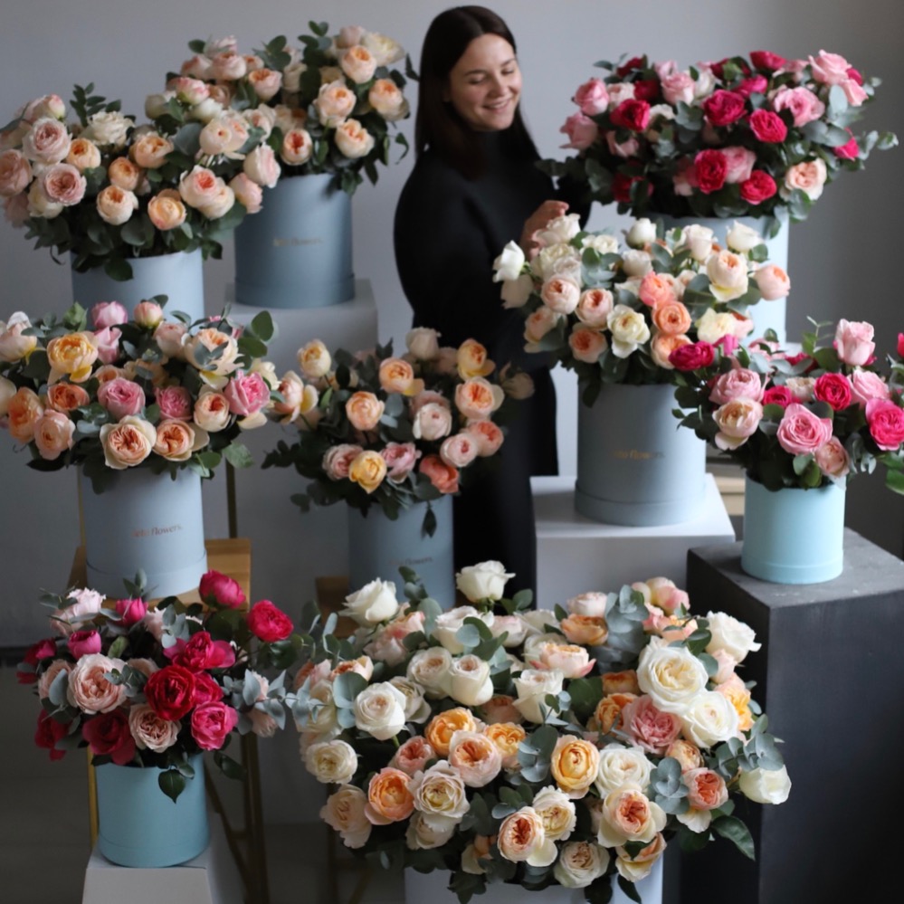 The "Rose Garden" set consists of hat boxes of different sizes with bouquets of garden roses. Garden roses are one of our bestsellers, they are loved by every lady, they look impressive and interesting. In the set we combine different varieties that you can look at for a long time and enjoy their fragrant.