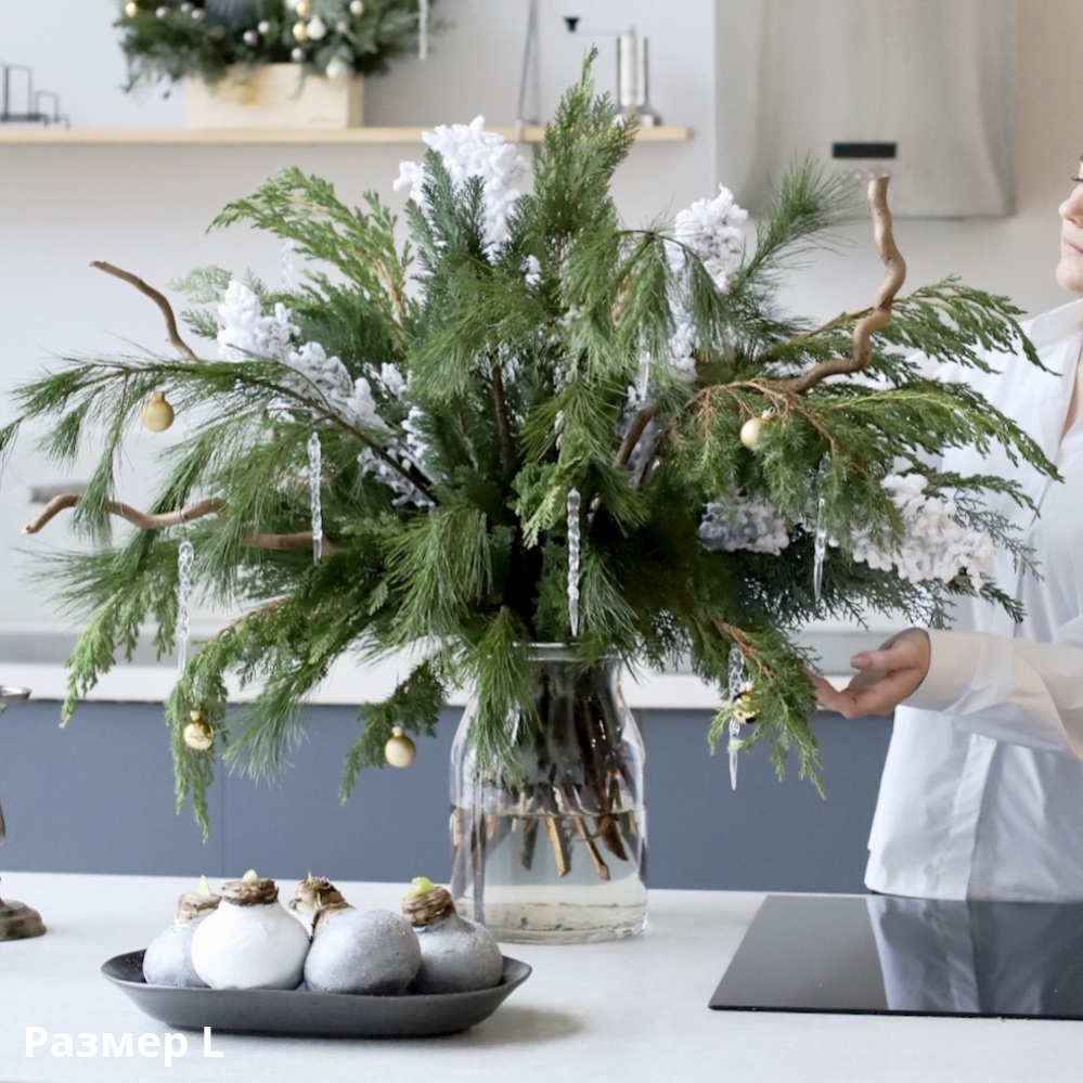 Compositions from the "Marengo" collection will be as close as possible to the examples on the site. The arrangement of the decor, the shade of the pine needles may differ, vases, boxes and flower pots can be replaced with similar analogues.